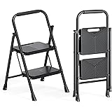 Urackify 2 Step Ladder, Portable Folding Ladder for Multi-Purpose, Home, Kitchen, Heavy Sturdy Steel Step Stool with Handrail, Anti-Slip Wide Pedals, Safe-Lock Design, Pass 500lbs Load Testing, Black