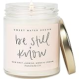 Sweet Water Decor, Be Still and Know, Sea Salt, Jasmine, Cream, and Wood Scented Soy Wax Candle for Home - Christian Candle Gifts for Women - 9oz Clear Jar, 40 Hour Burn Time, Made in the USA